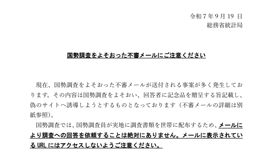 国勢調査を装った不審なメールが相次いで確認されています。